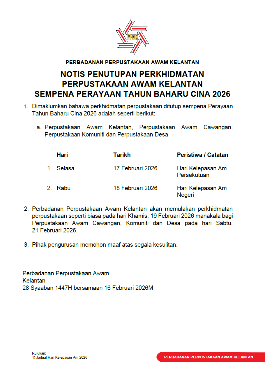 Notis penutupan perkhidmatan perpustakaan sempena Perayaan Tahun Baharu Cina 2026