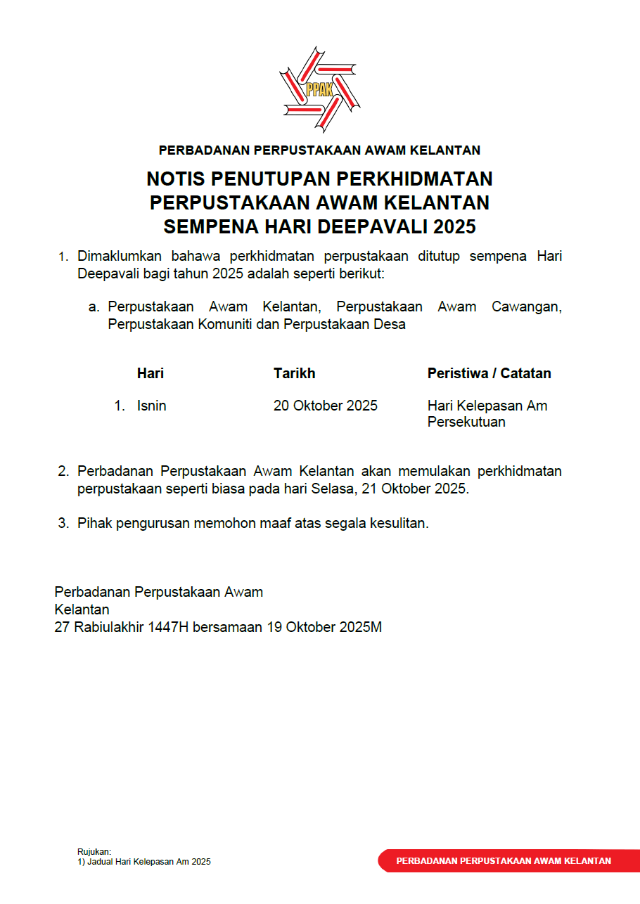 Notis penutupan perkhidmatan perpustakaan sempena Hari Deepavali 2025