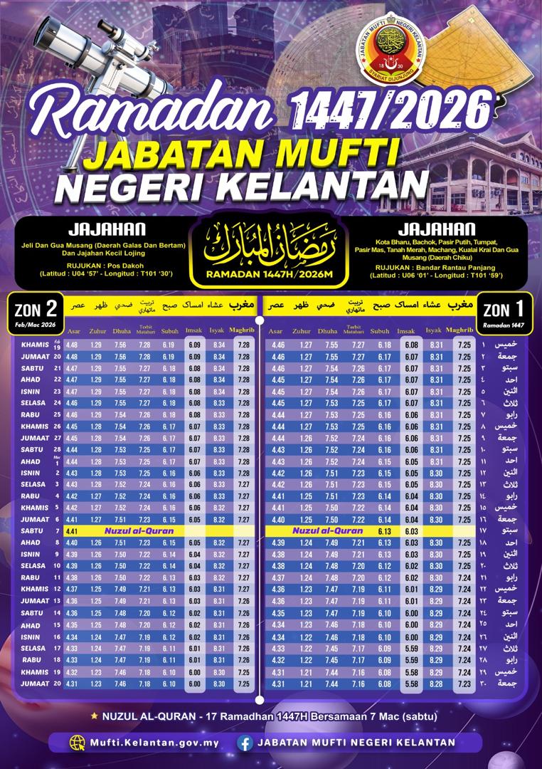 Jadual Waktu Imsak dan Berbuka Puasa Tahun 1447H / 2026M Negeri Kelantan (Sumber: Jabatan Mufti Negeri Kelantan)